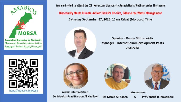 Invitation au 2ᵉ webinaire de l’Association Marocaine de Biosécurité Vous êtes cordialement invités à participer au 2ᵉ webinaire de l’Association Marocaine de Biosécurité (MOBSA)sous le thème : « Biosecurity